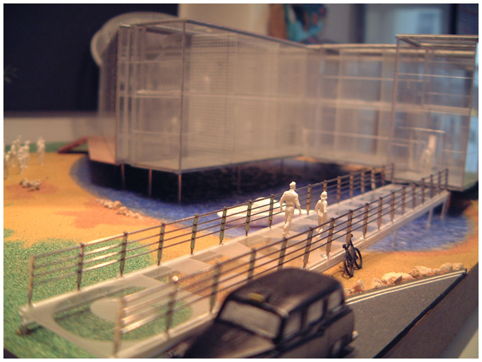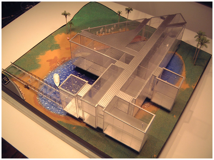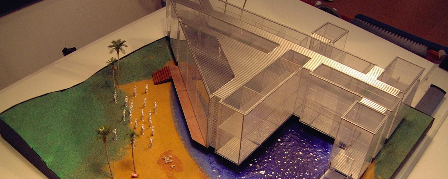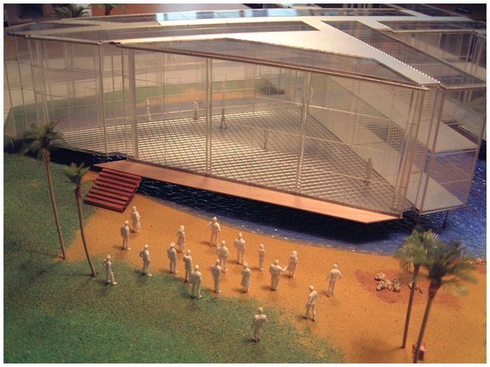 I was asked by Granada TV to design not a set but an entire building for a breakfast show they where pitching to the network Channel 4. I loved the idea that the opening titles could use a helicopter shot over the building that would be shaped as per the number 4. I also put a beach palm trees and lake outside the studio window which was an ironic joke as the building was to be built in rainy Manchester.