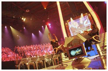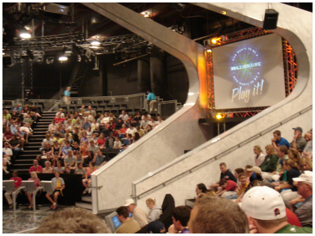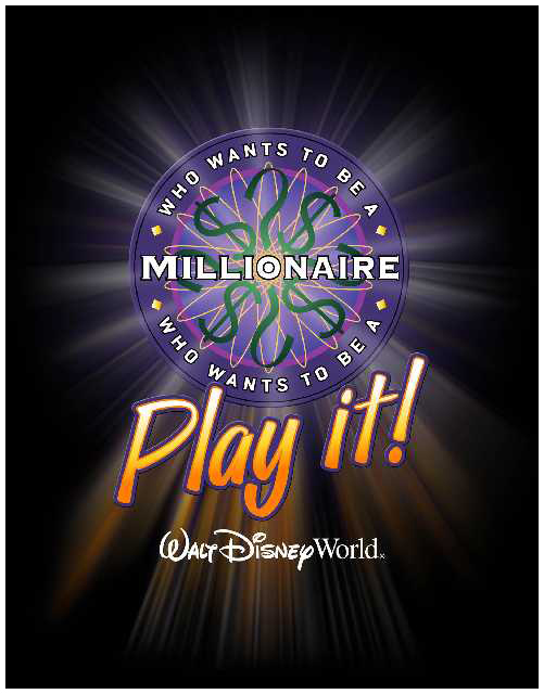 WHO WANTS TO BE A MILLIONAIRE, PLAY IT! was an attraction at Disney's Hollywood Studios theme park at Walt Disney World Resort in Orlando, Florida and Disney's California Adventure Park in Anaheim, California. The attraction was a modified version of the TV show with several shows per day lasting 25 minutes. The set was an enlarged version of my standard design to allow for larger audience ( 647 park guests ).