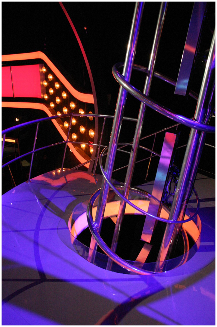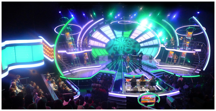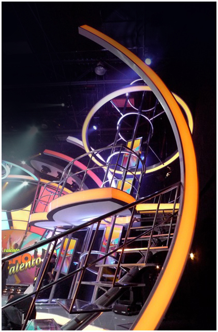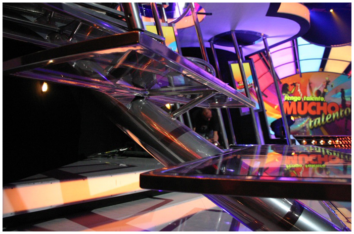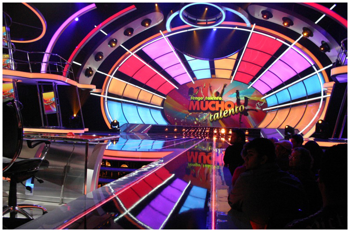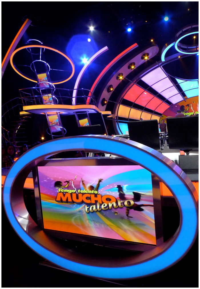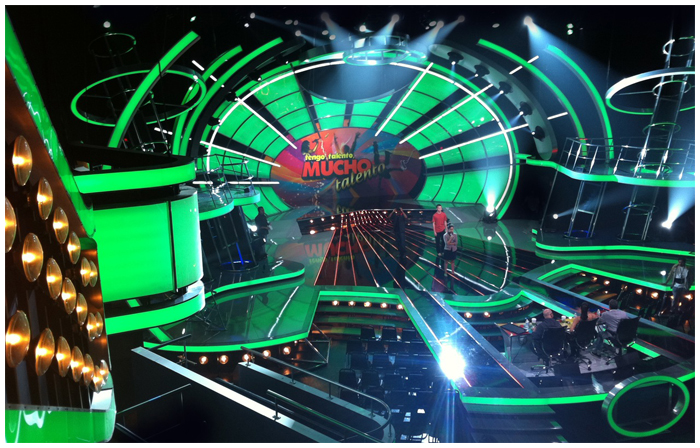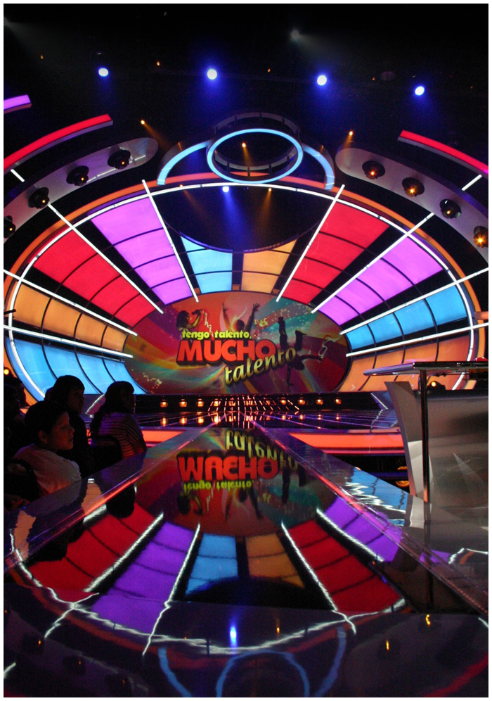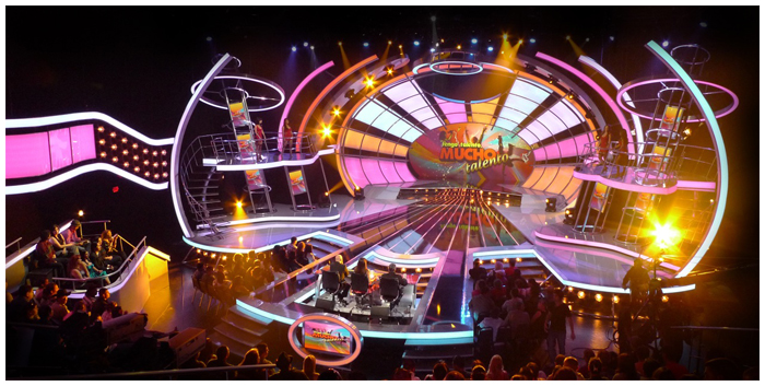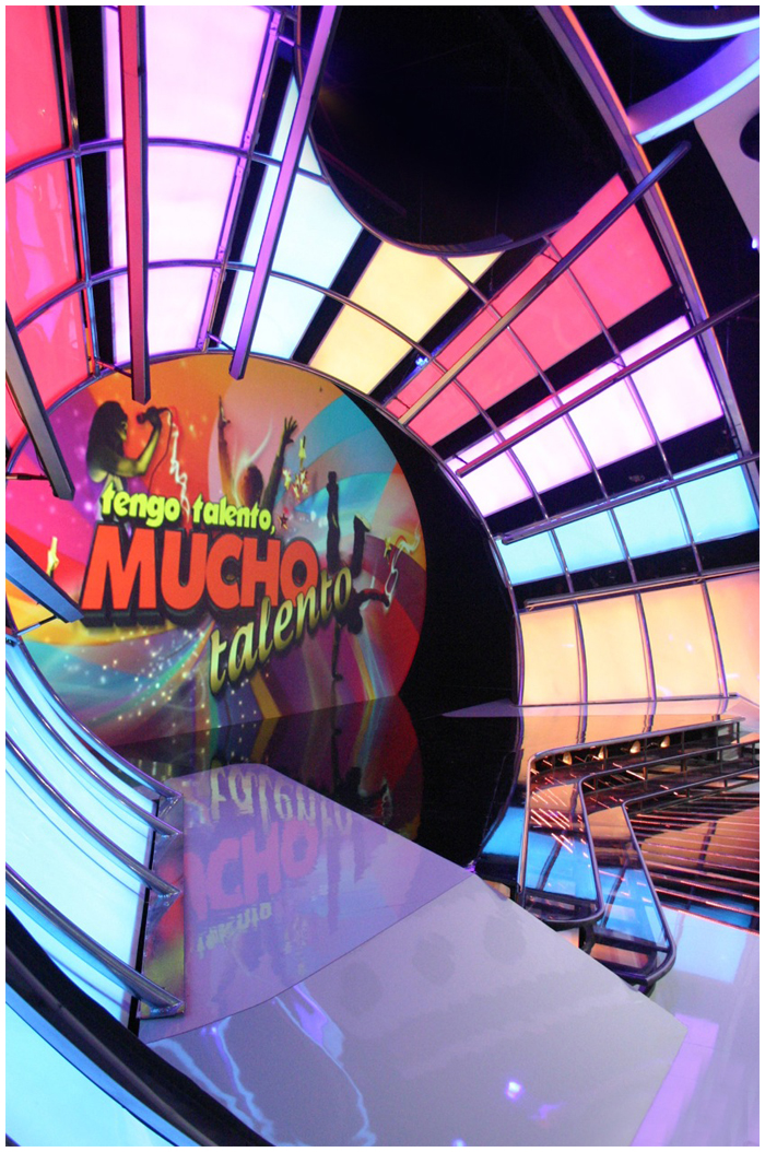CHRISTMAS 2010 I WAS APPROACHED BY THE OWNERS OF LATIN NETWORK ESTRELLA TV TO DESIGN THEIR VERSION OF ' AMERICAS GOT TALENT ' I WAS TEMPTED WITH A HUGE BUDGET AND THE COMPANY PURCHASED A SOUND STAGE IN BURBANK SPECIALLY TO HOUSE THE SHOW. I WAS ABLE TO BRING IN MY CHOICE OF LIGHTING DIRECTOR AND STAGE CREW AND THE NETWORK OWNERS GAVE ME COMPLETE FREE REIGN AND TRUSTED ME WITH A MILLION DOLLARS OF THEIR MONEY. THIS IS WITHOUT DOUBT THE FIRST TIME IN MY CAREER THAT I HAVE HAD A GRAND BUDGET AND COMPLETE TRUST IN ME TO DO WHAT I DO. USUALLY THERE ARE ENDLESS BUDGET STRUGGLES, PERSONALITY CLASHES AND PRODUCERS MEDDLING WITH MY INITIAL DESIGNS UNTIL YOU SEE A WATERED DOWN SHADOW ON TV OF WHAT I INITIALLY CREATED.. MUCHO TALENTO IS PERHAPS THE SINGLE BEST REPRESENTATION OF MY CAPABILITIES IN THE TV INDUSTRY WHEN ACTUALLY TRUSTED.. I LOVE THIS SET.