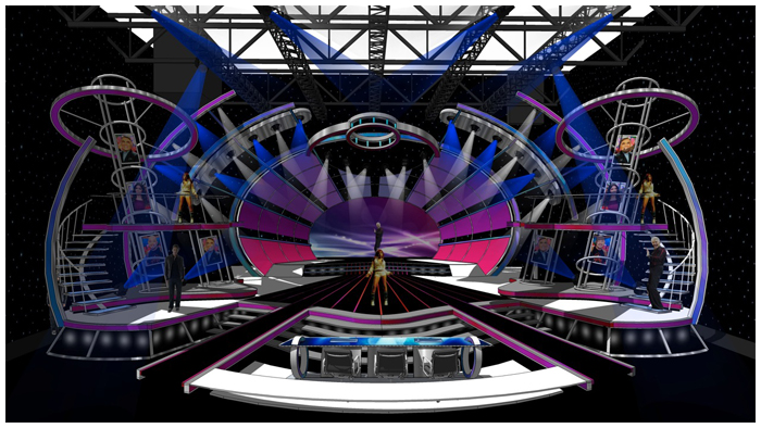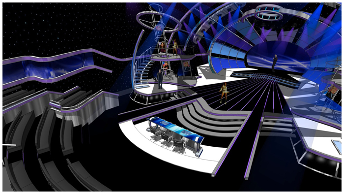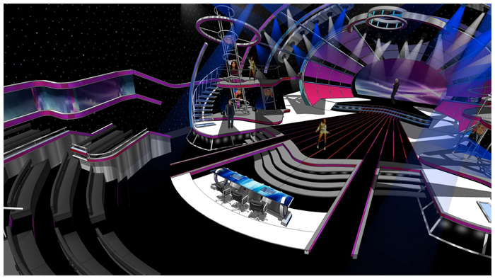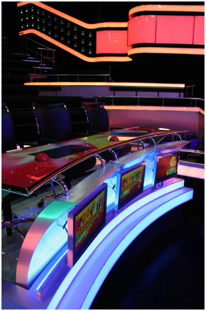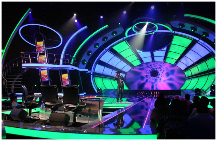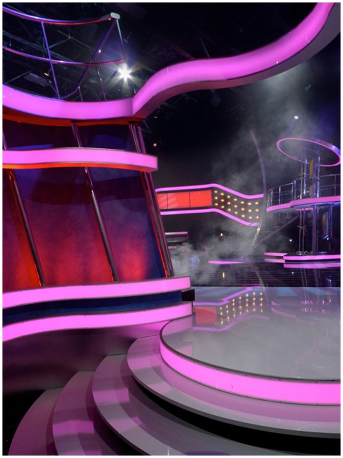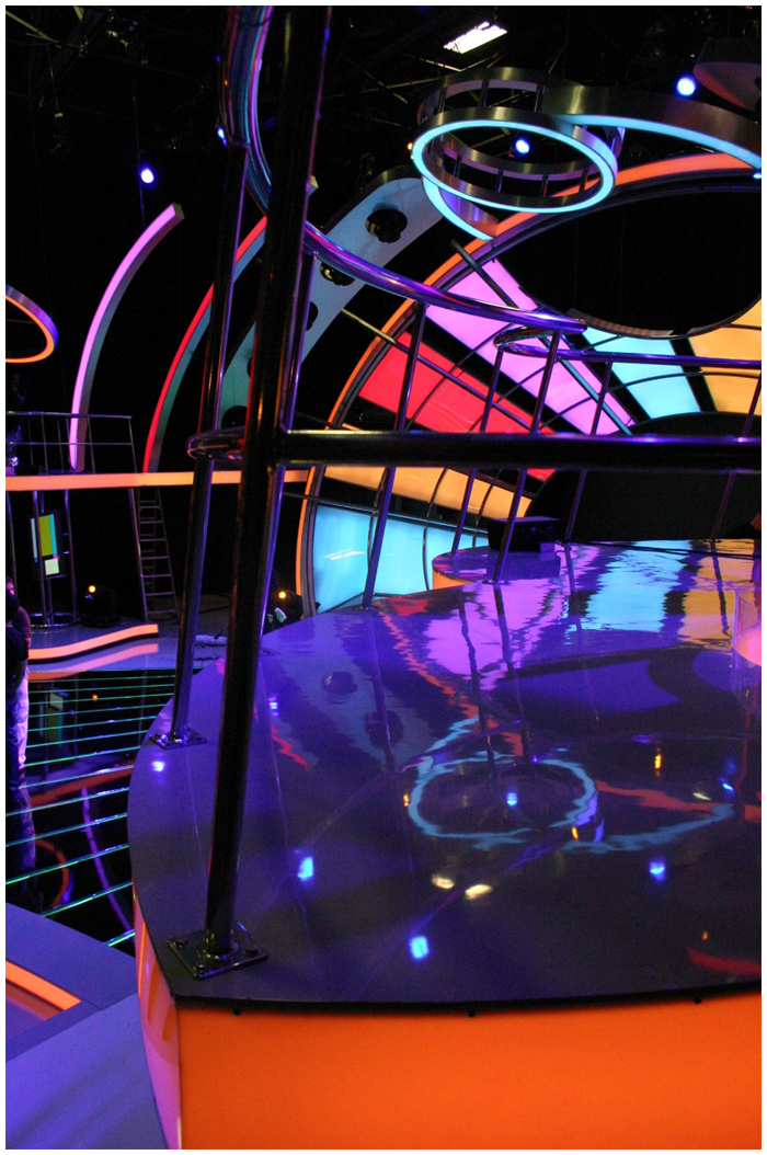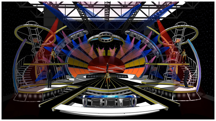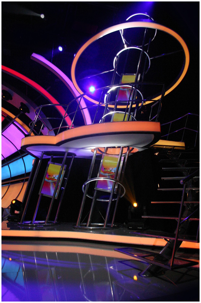 CHRISTMAS 2010 I WAS APPROACHED BY THE OWNERS OF LATIN NETWORK ESTRELLA TV TO DESIGN THEIR VERSION OF ' AMERICAS GOT TALENT ' I WAS TEMPTED WITH A HUGE BUDGET AND THE COMPANY PURCHASED A SOUND STAGE IN BURBANK SPECIALLY TO HOUSE THE SHOW. I WAS ABLE TO BRING IN MY CHOICE OF LIGHTING DIRECTOR AND STAGE CREW AND THE NETWORK OWNERS GAVE ME COMPLETE FREE REIGN AND TRUSTED ME WITH A MILLION DOLLARS OF THEIR MONEY. THIS IS WITHOUT DOUBT THE FIRST TIME IN MY CAREER THAT I HAVE HAD A GRAND BUDGET AND COMPLETE TRUST IN ME TO DO WHAT I DO. USUALLY THERE ARE ENDLESS BUDGET STRUGGLES, PERSONALITY CLASHES AND PRODUCERS MEDDLING WITH MY INITIAL DESIGNS UNTIL YOU SEE A WATERED DOWN SHADOW ON TV OF WHAT I INITIALLY CREATED.. MUCHO TALENTO IS PERHAPS THE SINGLE BEST REPRESENTATION OF MY CAPABILITIES IN THE TV INDUSTRY WHEN ACTUALLY TRUSTED.. I LOVE THIS SET.