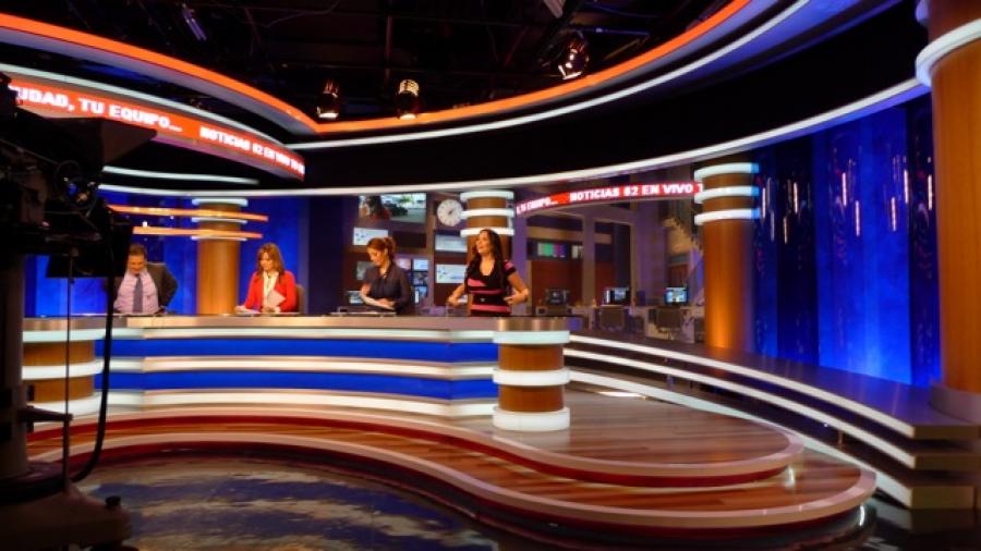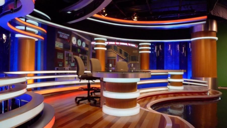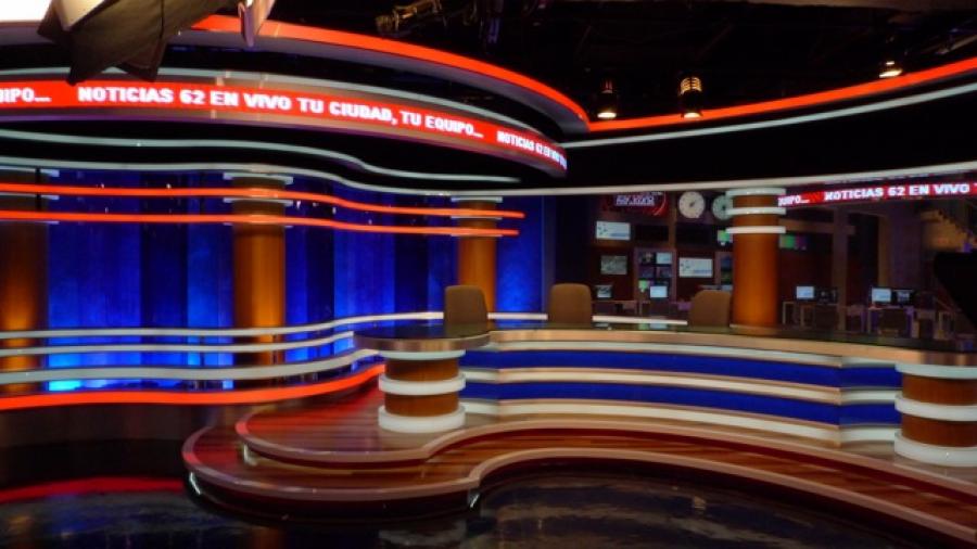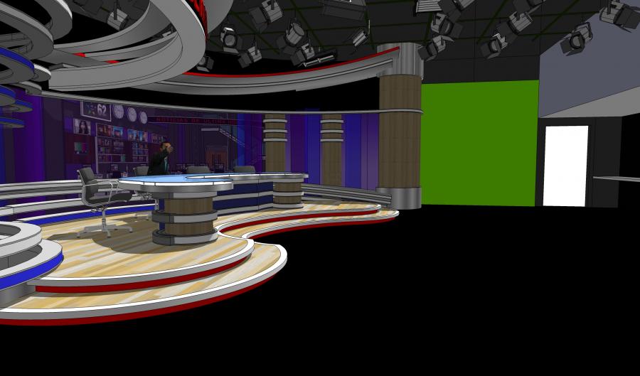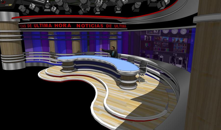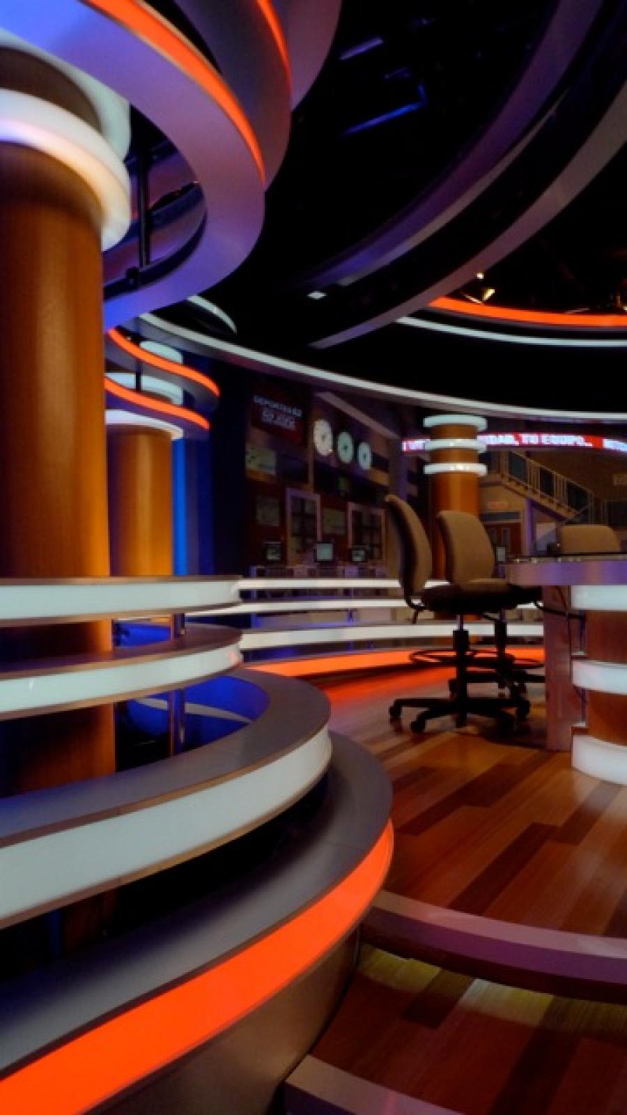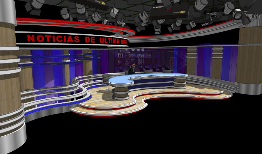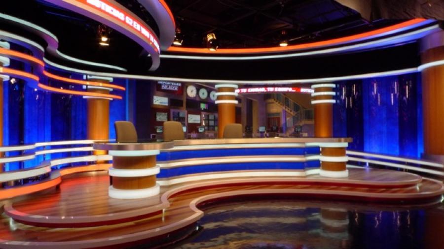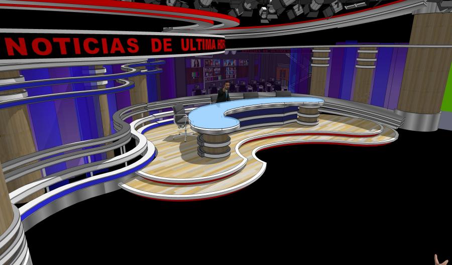 ESTRELLA TV'S LOCAL LOS ANGLES BASED NEWS IS AN IMPORTANT NEWS SOURCE FOR LATINO PEOPLE LIVING IN SOUTHERN CALIFORNIA. MY FAVORITE PART OF THIS SET IS THE FAKE ' NEWS ROOM OFFICE ' BEHIND THE SET, THIS IS IN FACT A FIVE FEET DEEP AREA WITH A MINIATURE FORCED PERSPECTIVE ROOM, TINY LITTLE FAKE DESKS A PINT SIZED STAIRCASE AND DOORS ADD TO THE ILLUSION
