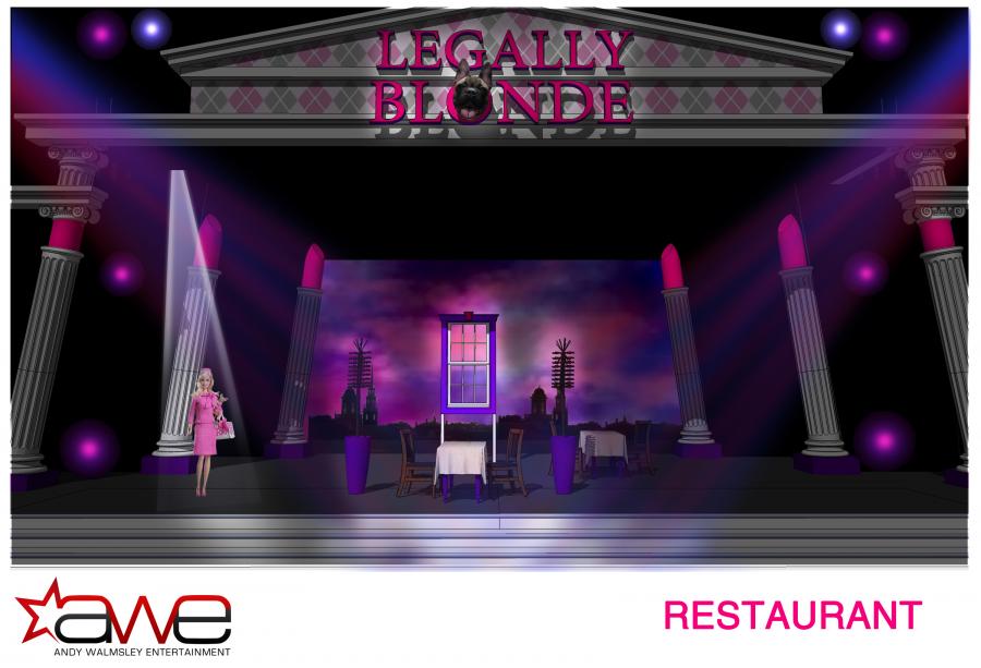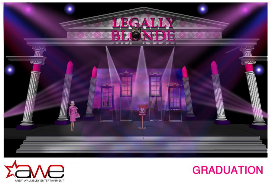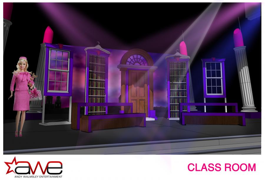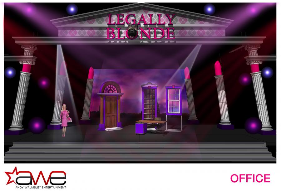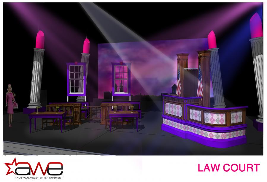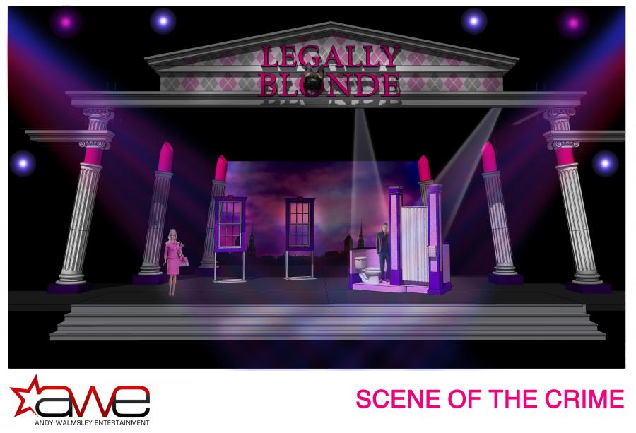 Legally blonde is a really fun high energy adaptation of the original movie featuring Elle Woods as she follows her heart to Harvard to take a degree in law just to be close to her ex boyfriend. Full of whimsical songs I decided to approach the set in a similar almost cartoon style with lots of nods to Elle's love of fashion and make up