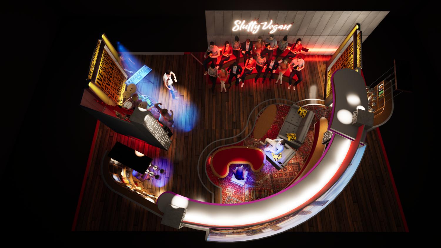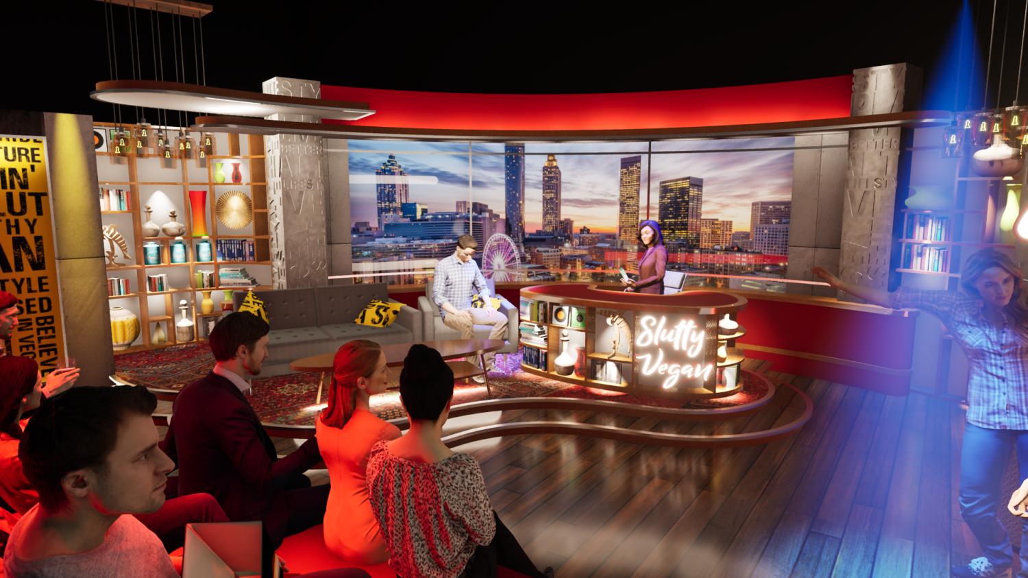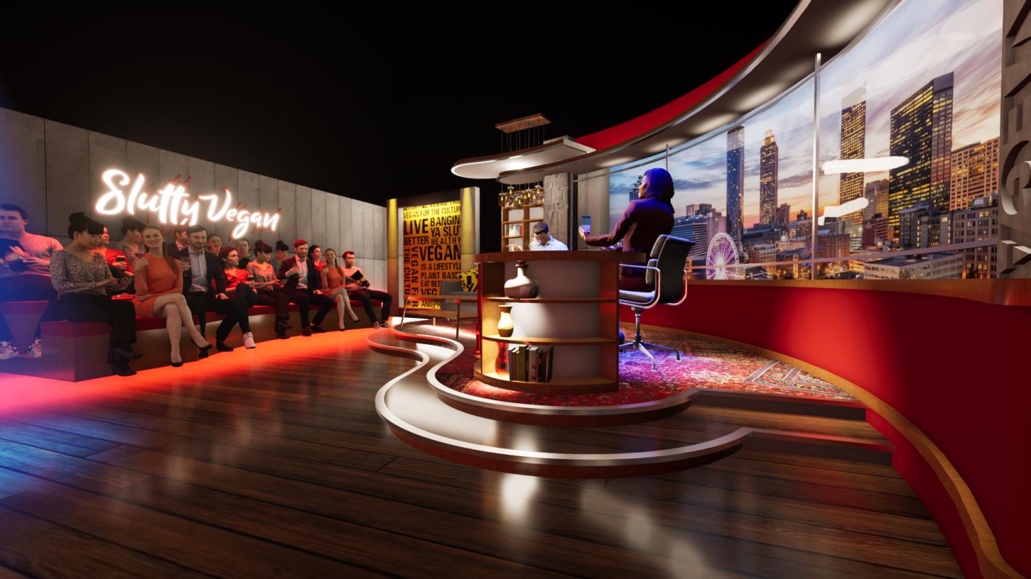 The highly successful Slutty Vegan restaurant chain approached me to create a small You Tube chat show set for them.  The set had to fit in an existing ( tiny ) warehouse space in Atlanta.