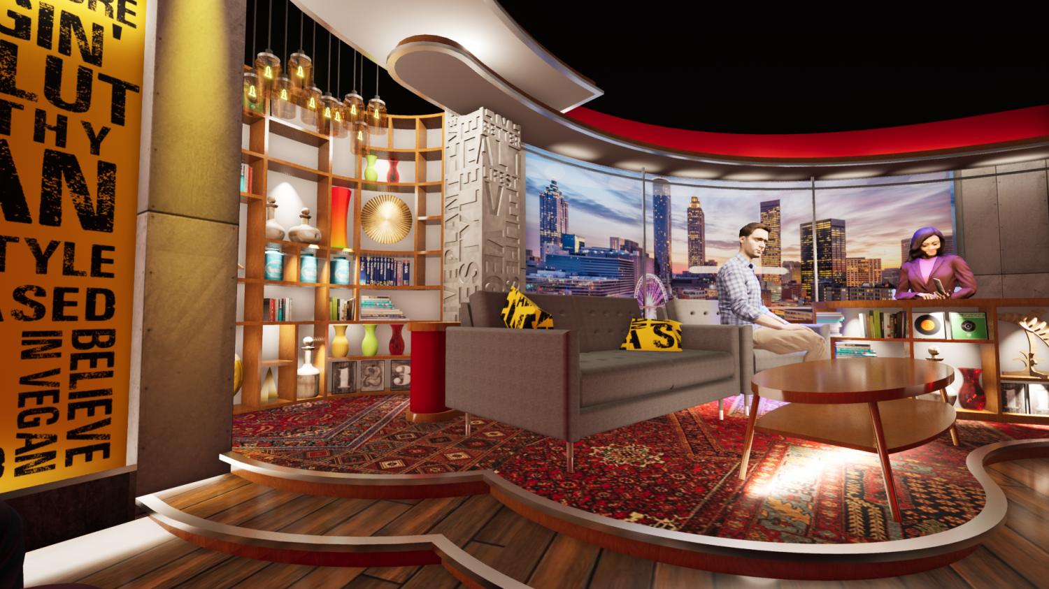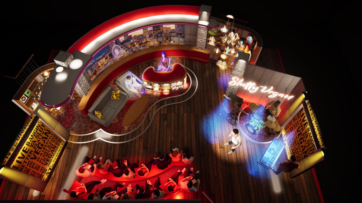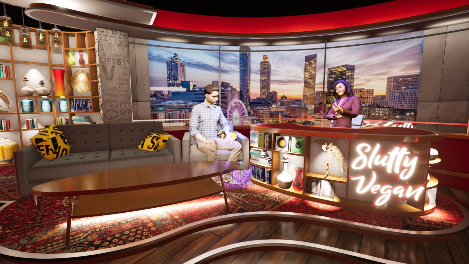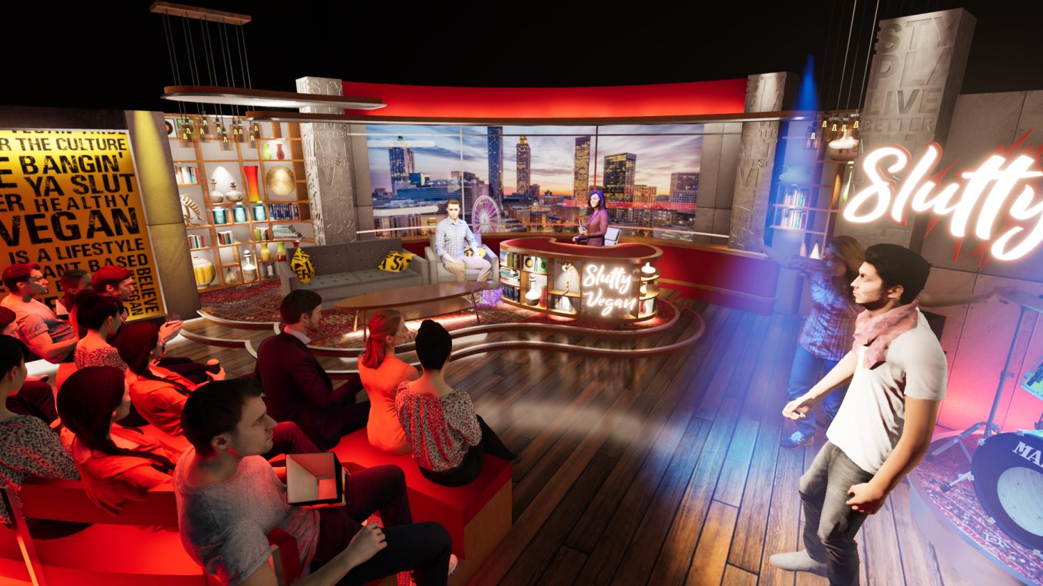 The highly successful Slutty Vegan restaurant chain approached me to create a small You Tube chat show set for them.  The set had to fit in an existing ( tiny ) warehouse space in Atlanta.